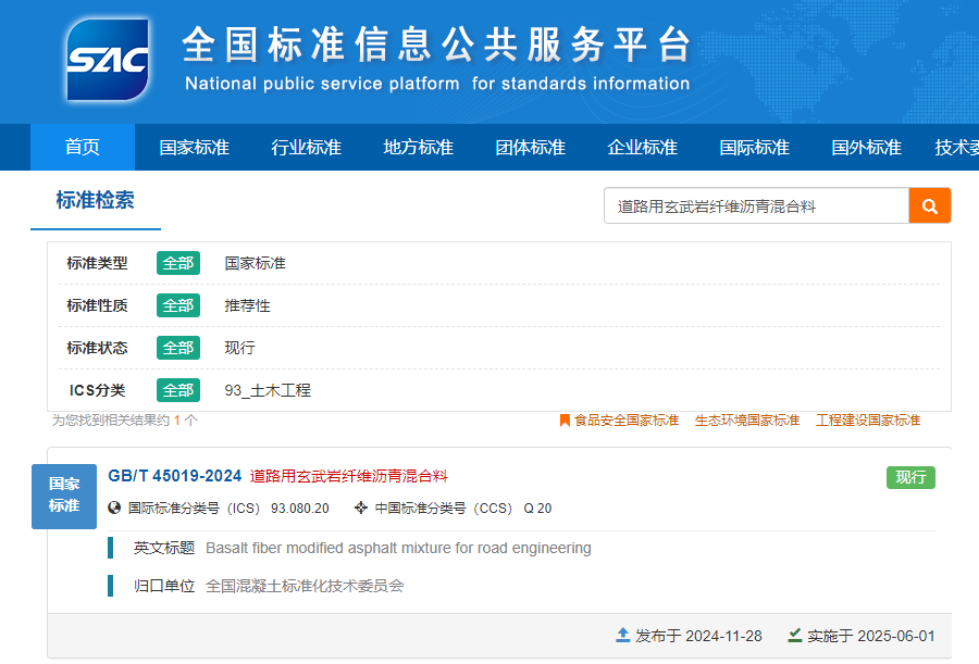 24年11月28日,国家市场监督管理总局(国家标准化管理委员会)发布公告,由TC458(全国混凝土标准化技术委员会)归口,主管部门为住房城乡建设部。起草单位为河南交院工程技术集团有限公司 、交通运输部科学研究院 、河南交通职业技术学院 、山东省交通规划设计院集团有限公司 、中国建筑科学研究院有限公司 、中国建筑第七工程局有限公司 、中铁十二局集团第四工程有限公司 、宁夏交通建设股份有限公司 、河南四通工程检测有限公司 、四川炬原玄武岩纤维科技有限公司 、中交二公局第四工程有限公司 、深圳海川新材料科技股份有限公司 、青岛玄武岩复合材料研究院 、河南安罗高速公路有限公司 、河南省公路工程局集团有限公司编制的国家标准《道路用玄武岩纤维沥青混合料》(GB/T 45019-2024)获批发布,于2025年6月1日起正式实施。