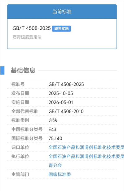GB/T 4508-2025 于 2025 年 10 月 5 日发布,2026 年 5 月 1 日正式实施,全面替代 2010 版标准。此次修订响应两大核心需求:一是适配沥青材料体系发展,随着乳化沥青、改性沥青等新型材料广泛应用,旧标准适用范围已显局限;二是接轨国际技术标准,修改采用 ASTM D113/D113M-17 (2023) e1 版标准,为进出口沥青产品检测提供统一技术依据。